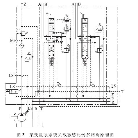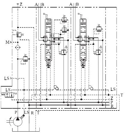 變量泵系統負載敏感比例多路閥與定量泵系統中的相比,主要區別是不含三通壓力補償器,其原理圖如圖2。這是由于變量泵系統負載敏感比例多路閥,在配變量泵使用時(shí),將負載壓力信號Ls引入變量泵的變量機構,從而實(shí)現對流量壓力的控制,無(wú)需再加三通壓力補償閥。