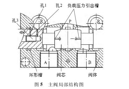 某負載敏感比例多路閥主閥內部主要結構如圖5所示,閥芯處于中位時(shí),LS通過(guò)閥體上的流道被引入環(huán)形槽中,由于閥體上的環(huán)形槽與閥芯上的孔1孔2孔3和沉割槽與回油流道R相通,***后Ls被引入回油釋放掉。